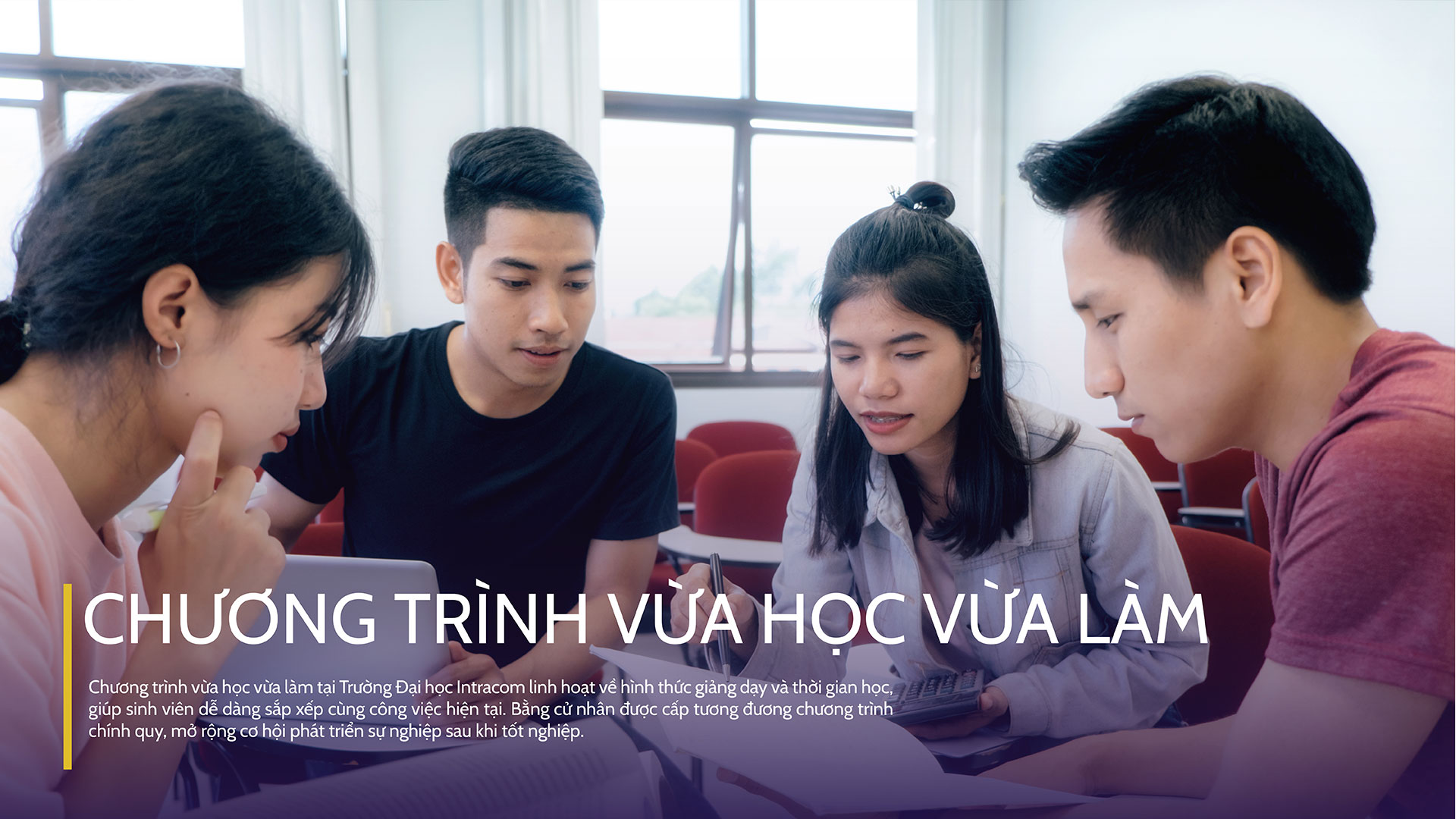 Hiện nay, Trường Đại học Intracom đang tổ chức chương trình đào tạo Đại học vừa học vừa làm với mức chi phí hợp lý, thời gian đào tạo linh hoạt để phù hợp với nhiều đối tượng.